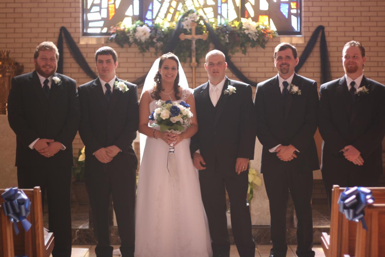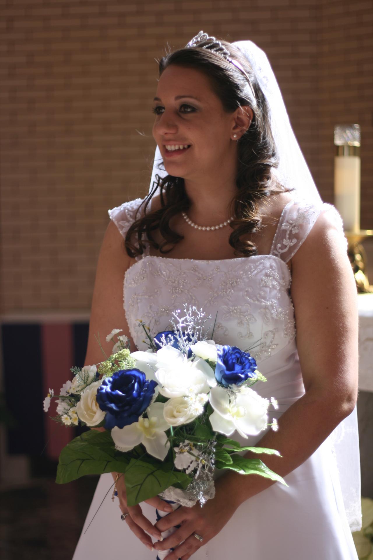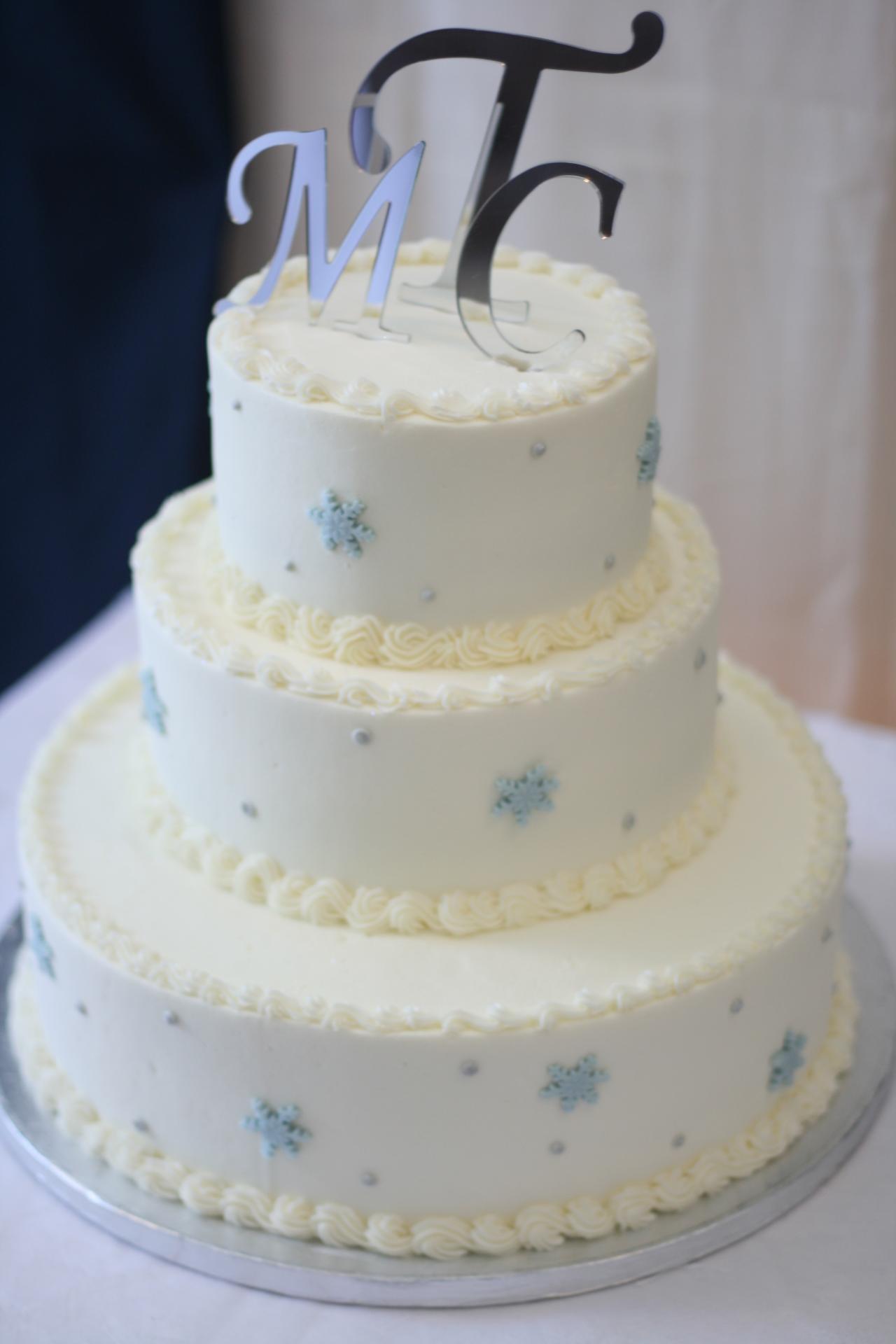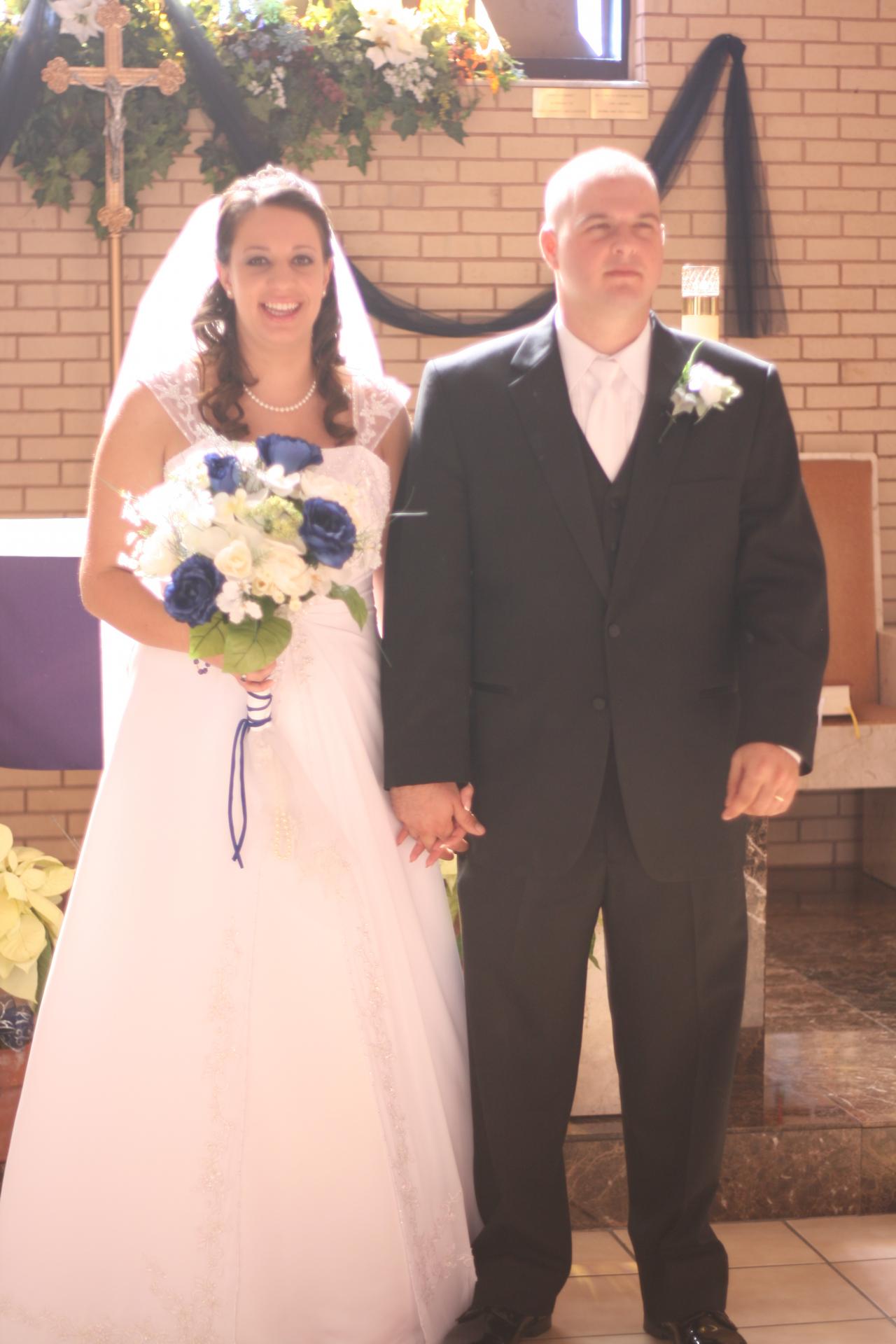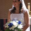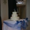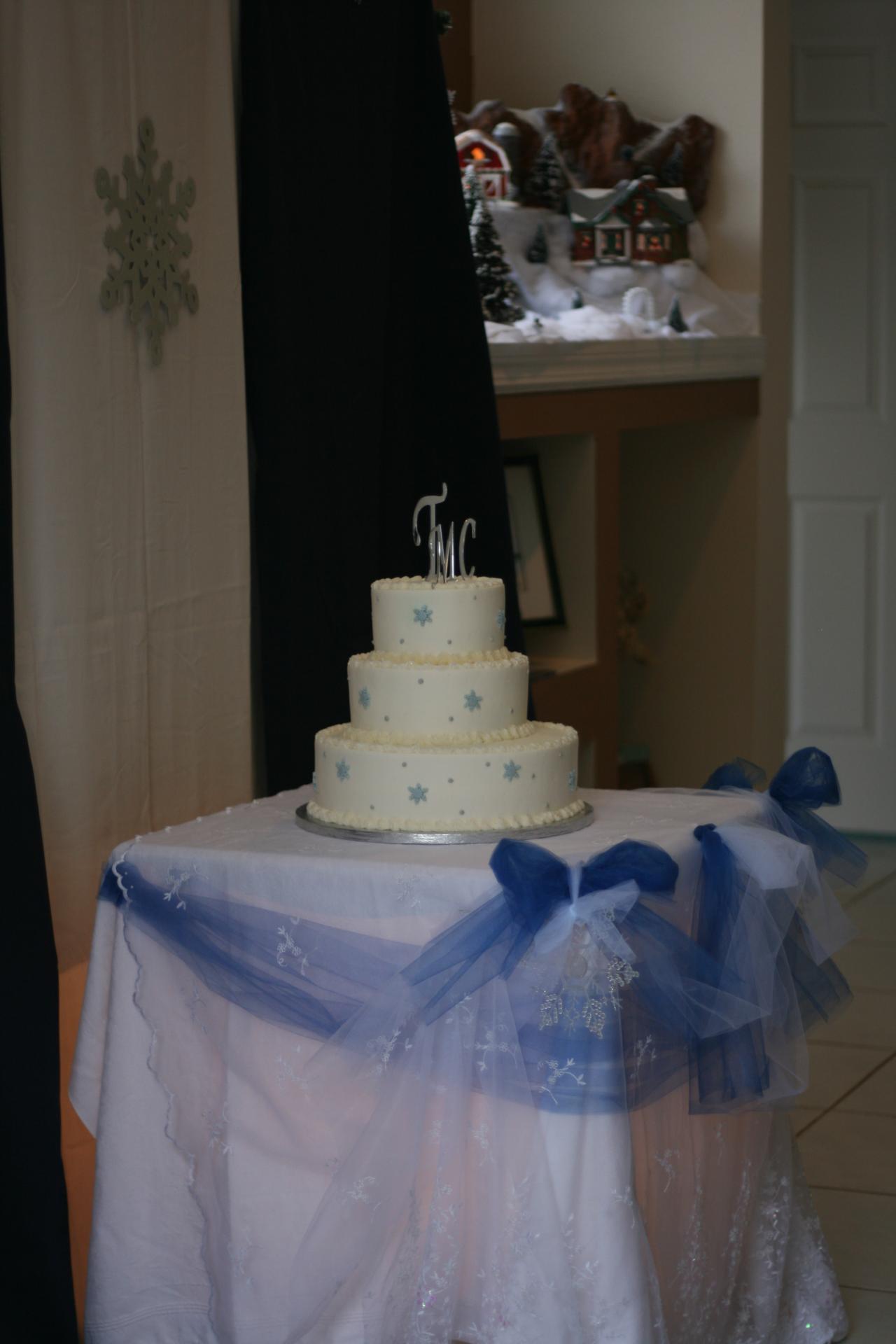 Megan and Chris' wedding was a winter theme with blue and white as the dominate colors. The dress was by David's Bridal, the veil by Engagement Matters, the florals by Engagement Matters, the cake by Sweeties Delectables, the photography by Michelle Brown Photography.