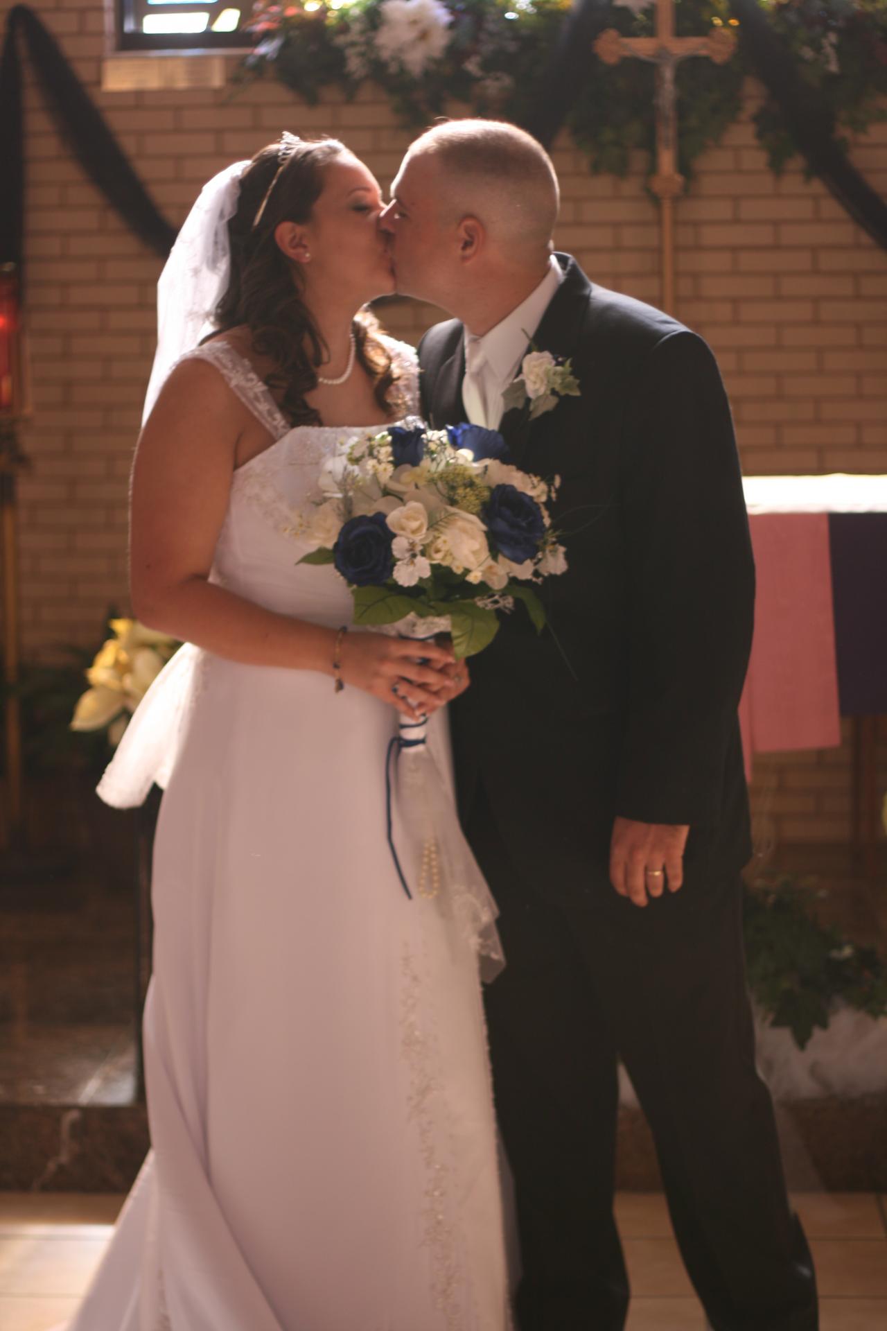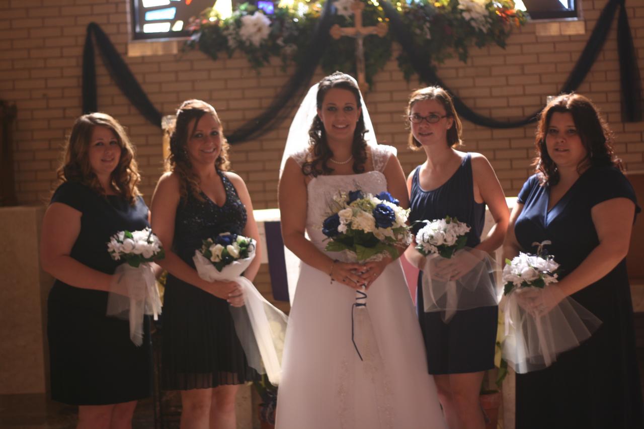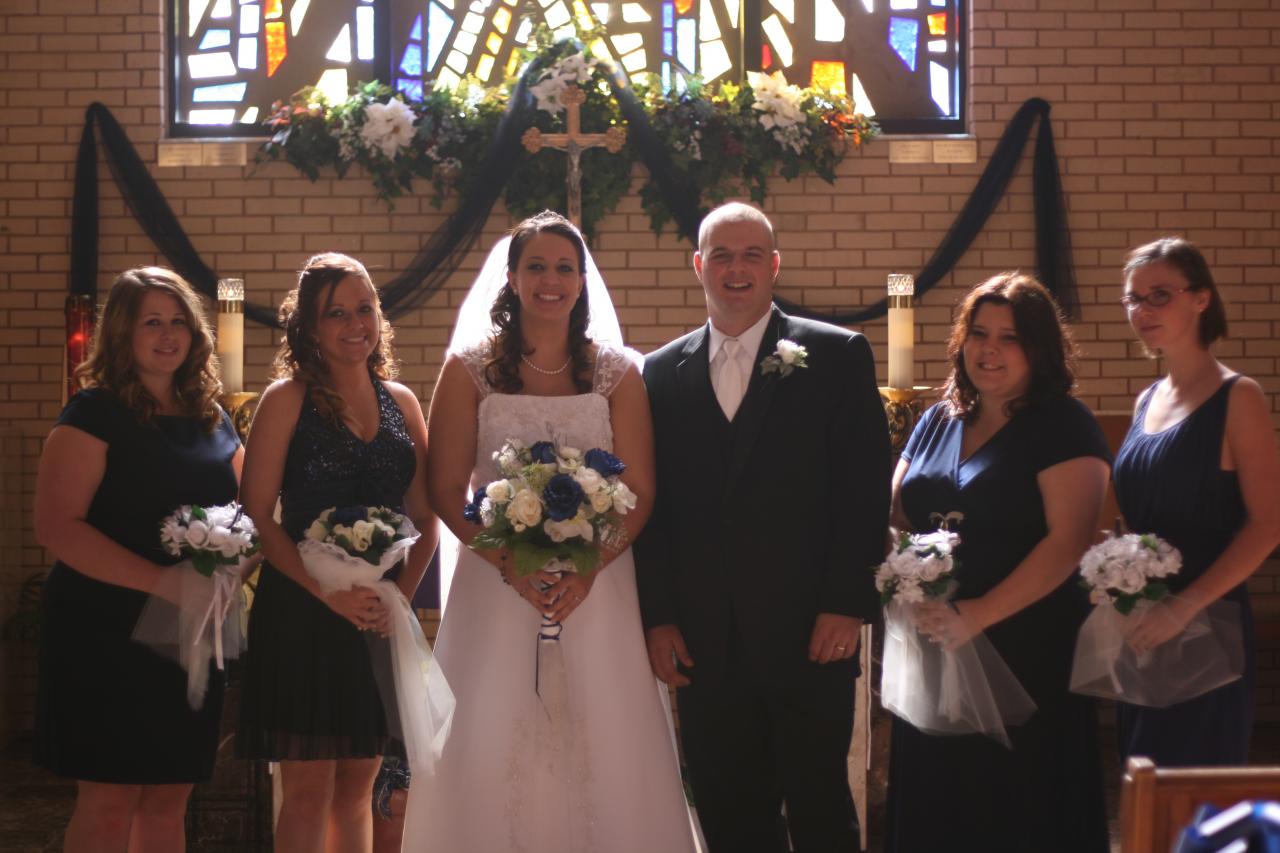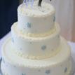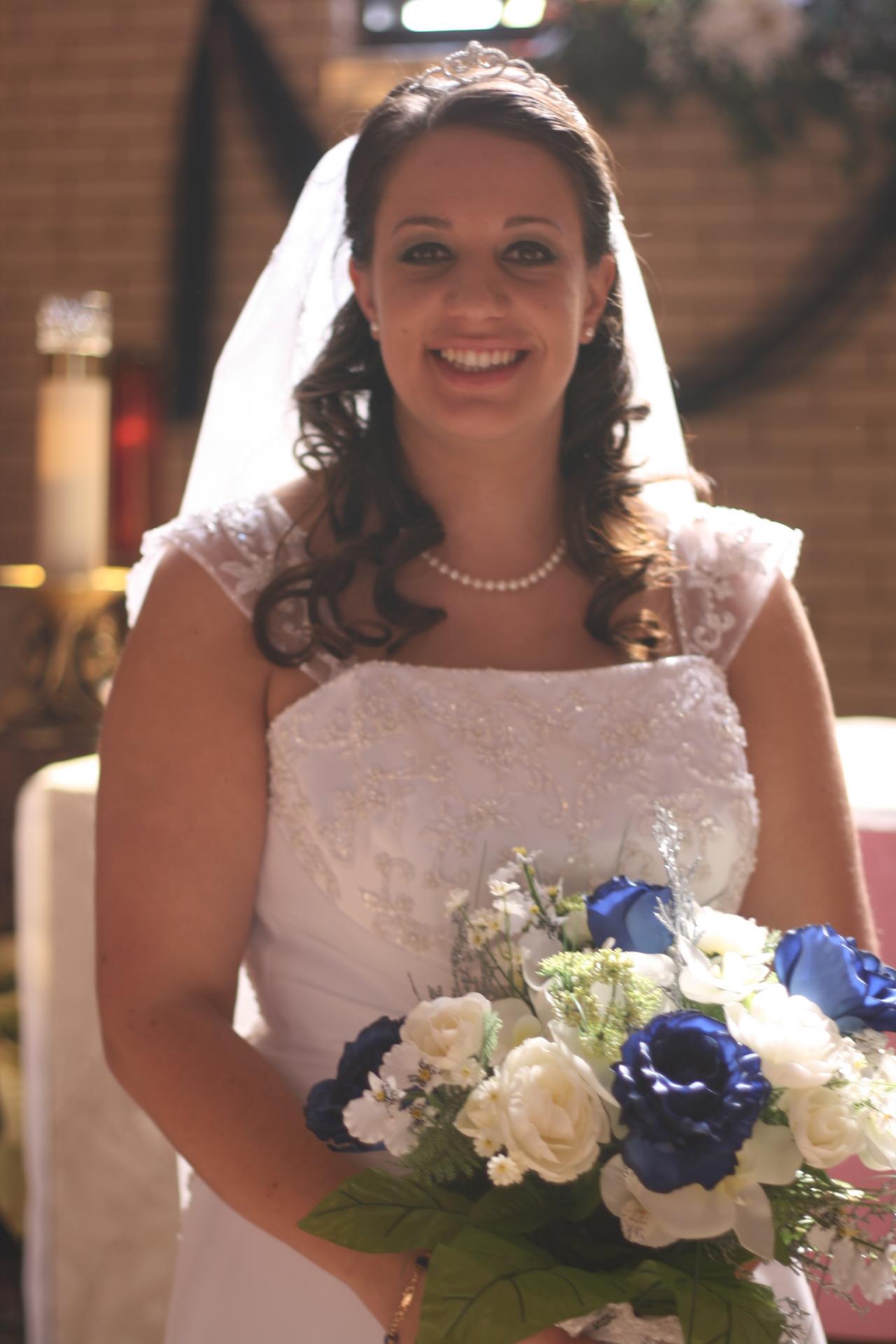 Megan and Chris' wedding was a winter theme with blue and white as the dominate colors. The dress was by David's Bridal, the veil by Engagement Matters, the florals by Engagement Matters, the cake by Sweeties Delectables, the photography by Michelle Brown Photography.